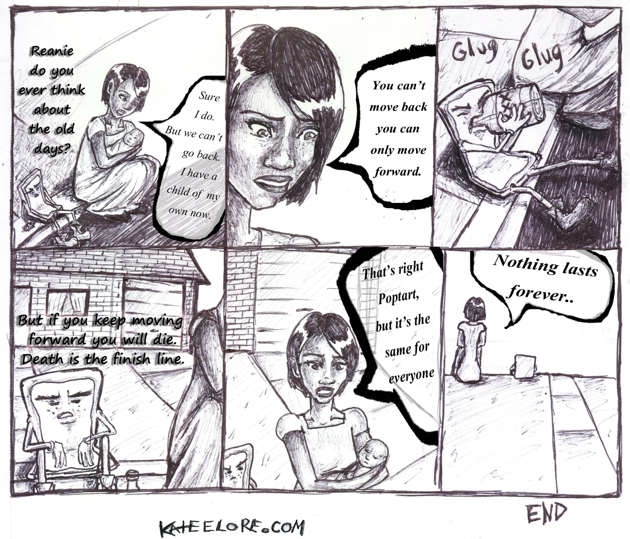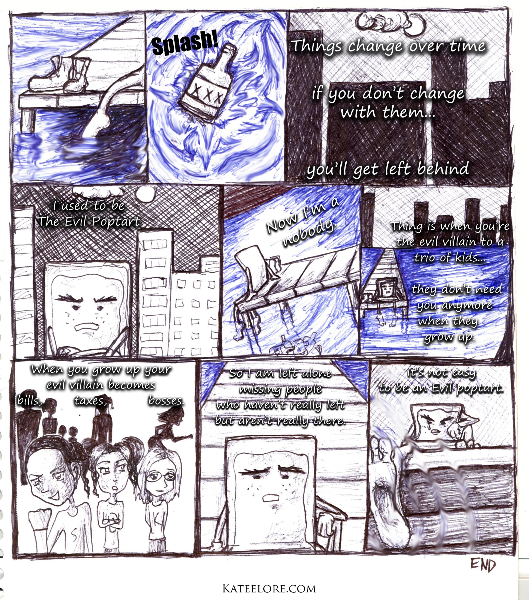It took me ten years to think of Poptart again. I was attending Sinclair Community college in Dayton Ohio at the time. This was after I’d written five novels of a fantasy series and spent an entire year to create a single spin off comic book of thirty pages. Tired of working on long projects that go nowhere I wanted to do something small, short and strip panel based. I wanted something I could work on every now and then without so much pressure. I decided to bring back the evil Poptart as a sort of closing of the book to that part of my life. My original intent was for something of a dark comedy web comic strip. Like many things in life Melancholy Evil Poptart did not turn out the way I wanted it to. Somehow bringing back this character from my childhood brought out some dark inner feelings that I’d been suppressing from myself. I found myself reflected in ever character arguing against my own contrasting thoughts.