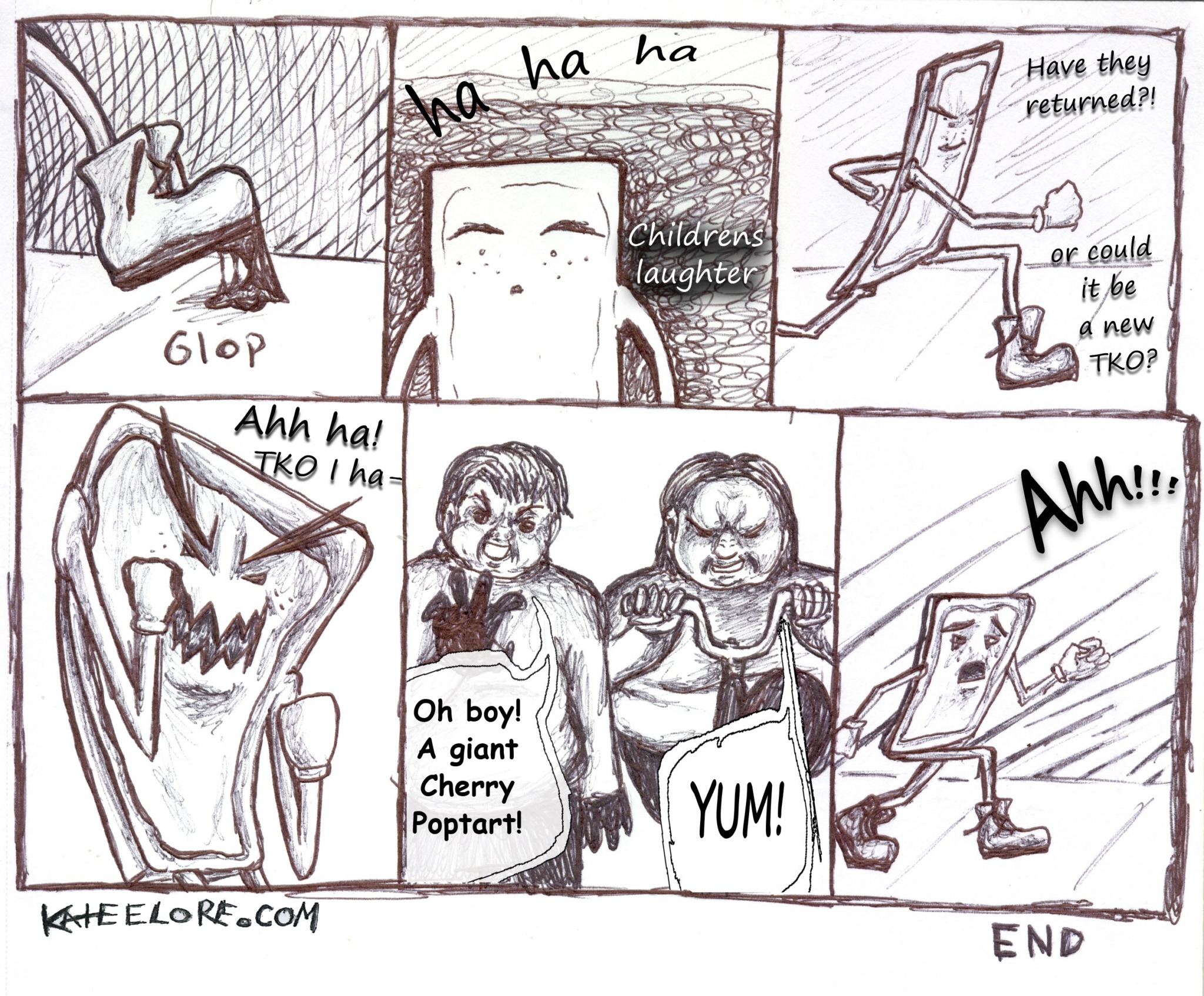 At first we told our stories in the form of comic panels. These were sloppily drawn and only semi planned out. Three TKO girls in particular lived out adventures each one taking a turn at the reigns creating elaborate scenarios and silly situations. There were a few made up characters but the main characters were always ourselves. We were the same girls except bigger, better, and capable of anything. In real life a child in middle school stands quite small in this big world, but in our comic books we were powerful and therefore only an evil super villain could challenge us. This is where the Evil Poptart came from and you can find him in the vast majority of the TKO works.